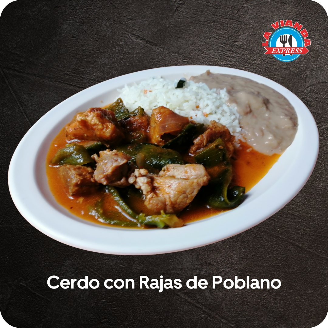 Cerdo con rajas de poblano preparado con carne suave y jugosa guisada lentamente en salsa casera con chile poblano Acompañado de arroz y frijoles es un platillo reconfortante de comida casera ideal para comer en el restaurante pedir para llevar o recibir a domicilio en Morelia Sabor tradicional ingredientes frescos y el tiempo que tú mereces en La Vianda Express