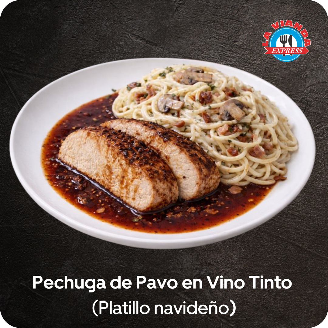 Pechuga de pavo en vino tinto preparada al momento con gravy casero y acompañamientos que resaltan su sabor Un platillo de comida casera ideal para comer en el restaurante pedir para llevar o recibir a domicilio en Morelia Calidad sabor y tiempo bien aprovechado como solo en La Vianda Express